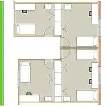 The majority of the rooms were divided into alcoves of four rooms, with two inner rooms and two outer rooms. Originally the large outer rooms were occupied by two freshers[6] and the smaller outer room would have a more senior student. The inner rooms were normally reserved for sophomores and seniors. Once the girls were distributed evenly throughout the whole college, these alcoves were thus affectionately dubbed 'alcove families', with two males and two females constituting each group.