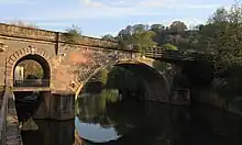 The eastern bridge is a elliptical stone arch, with a smaller circular arch either side. It was repaired in brick in 1927. Although not referred to as such, it is a skew bridge, crossing the river at about 45 degrees; it "embodies Brunel's ability to find elegant architectural solutions to engineering challenges."[19]