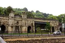 After the Skew Bridge, the line continues towards Bristol over St James' Viaduct, a "castellated Gothic fantasy"[24] with pointed arches and arrow slots on the northern (Bath-facing) side; the southern side is plainer. There are seventeen arches in total; the spans crossing Wells Road and Lower Bristol Road were rebuilt in steel in 1911–12 as locomotives had become heavier; the former span was again rebuilt in 1961–62.[23][24]