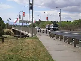 The Macquarie River divides Bathurst with the CBD located on the western side of the river. Four road bridges and two rail bridges span the river within the city area. From the upstream side they are: Macquarie River Railway Bridge (built in 1876[6]) closed in 2011 (replaced with a new concrete single track rail bridge structure alongside and brought into use in 2011); the four lane Evans Bridge which opened in 1995; the Denison Bridge opened in 1870 (closed to road traffic and now a pedestrian bridge); the Gordon Edgell Bridge, a low−level bridge located on George Street; and Rankens Bridge at Eglinton.