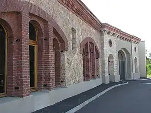 The principal battery, known as the caserne sous le parados (barracks under the entrance) is composed of gun chambers all oriented opening on the northeastern facade, with arched vaults expressed on the main wall as blind arches. Materials include limestone, millstone and brick. Concrete was added after 1879, and was retained in the 2006 renovation. A small bastion protects the entry from direct fire directly opposite the gate.
