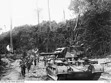 The operation was designated "Operation Oboe Two" by the Allies, who assigned 33,000 personnel.[23] The main ground forces, amounting to 21,000 personnel, were drawn from Major General Edward Milford's 7th Division, a veteran Second Australian Imperial Force formation consisting of three infantry brigades – the 18th, 21st and 25th – along with supporting artillery, armour, engineer and logistics support units. The 7th Division had seen action earlier in the war in the Middle East and in New Guinea, but had been resting on the Atherton Tablelands in Queensland when they were assigned to the operation.[1] The division's formation and unit-level command teams were all very experienced, but due to the high turn over of personnel that had occurred in the Australian Army in 1943–1944, many of its more junior personnel had not been in action before.[35] Tank support was provided by the 1st Armoured Regiment, equipped with Matilda tanks.[36] Naval support was drawn from the US 7th Fleet under Admiral Thomas Kinkaid,[37] while air support came from the Australian First Tactical Air Force,[38] and the US Thirteenth Air Force.[39] Three US Navy escort carriers were also assigned to provide fighter support as the airstrip at Tarakan had not been made operational in time, and weather conditions hampered the provision of fighter support from the Philippines.[40] A small number of Dutch KNIL troops, were also assigned to the operation,[41] amounting to a company from the 1st Infantry Battalion (KNIL).[36]