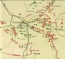 After the capture of the main trenches, some guns from the 60th (London) and 74th (Yeomanry) divisions were to target defences north and south of the main attack; others were deployed forward into the captured position to pursue the Ottoman forces with fire, attack stubborn defenders and deal with counterattacks.[119] A further advance by the 2/13th Battalion, London Regiment, 60th (London) Division, through the forward infantry battalions, attacked and captured two field guns beyond the final objective with Lewis guns after forcing the Ottoman detachments to retreat.[108] Desert Mounted Corps headquarters reported seeing Ottoman troops retiring into Beersheba at midday,[120] but it was not until late in the afternoon that two infantry brigades of the 54th (East Anglian) Division and the Imperial Camel Brigade, monitoring these defences north of the Wadi es Saba, became uncertain that the trenches were still defended. The 230th Brigade (74th Division) was ordered to launch an attack at 18:00 and an hour later, the reserve 230th Brigade occupied the northern trenches "with little difficulty". They had been abandoned by all but a few snipers, since Beersheba had already been captured by the light-horsemen's charge which had begun at 16:30.[109][121][122] The 60th (London) and 74th (Yeomanry) divisions bivouacked on the battlefield behind a line of outposts; the 53rd (Welsh) Division remained, covering the western flank while the 10th (Irish) Division bivouacked at Goz el Basal.[123]