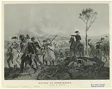 When the fighting broke out around 3:00 PM the German position was immediately surrounded by gunfire, which Stark described as "the hottest engagement I have ever witnessed, resembling a continual clap of thunder."[33] The Loyalists and Indian positions were overrun, causing many of them to flee or surrender. This left Baum and his Brunswick dragoons trapped alone on the high ground. The Germans fought valiantly even after running low on powder and the destruction of their ammunition wagon. In desperation the dragoons led a sabre charge in an attempt to break through the enveloping forces. The charge failed horrendously, resulting in massive German casualties and gaining no ground on the rebels. Baum was mortally wounded in this final charge, and the remaining Germans surrendered.[32]