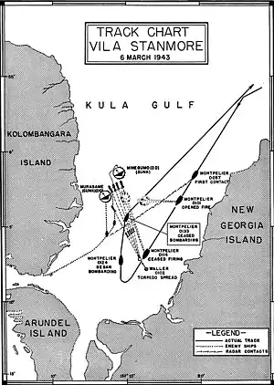 The Battle of Blackett Strait (Japanese: ビラ・スタンモーア夜戦 (Battle of Vila–Stanmore)) was a naval battle of the Pacific campaign of World War II, fought on 6 March 1943 in the Blackett Strait, between Kolombangara and Arundel Island in the Solomon Islands. The battle was a chance encounter between two Japanese destroyers that had been undertaking a resupply run to Vila and a U.S. Navy force of three light cruisers and three destroyers that had been tasked with bombarding the Japanese shore facilities around Vila. The two forces clashed as the Japanese destroyers were withdrawing through the Kula Gulf. In the short battle that followed the two Japanese destroyers were sunk, after which the U.S. ships completed their bombardment of Vila before returning to their base.