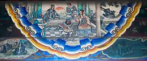 ![]() A scene from the Romance of the Three Kingdoms illustrated in a mural of the Long Corridor in the Summer Palace, Beijing: Zhang Fei scoffs at the newcomer Zhuge Liang and reluctantly takes his orders | |||||||