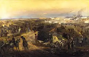 In the meanwhile, the Russian army deployed for attack. The 3. Russian light cavalry division, flanked from the left by the Muslim cavalry regiment and two companies of the Caucasus Mountain Riders rode around the Nagyerdő forest, attacking Korponay's division from the back, totally surprising them.[11] The 96. infantry battalion tried to defend themselves by forming a square formation, and repulsing the first attack of the 5. Lithuanian uhlan regiment, but they could not resist the second charge.[31] Being hit also by four heavy batteries, the weakest unit of Nagysándor's army crumbled under the attack, fleeing in the forest and in the city.[32] The retreating 96. battalion was covered by the 15. six-pounder battery, but their heroic fight could not counterbalance the overwhelming superiority of the Russian artillery, many of their cannons becoming unusable, and the left leg of the leader of the battery, Captain Márton Csányi, being shot off.[33] After the Hungarian artillery withdrew from the right flank, the 7. Russian Infantry Division was able to reach the forefront of the brickworks unhindered, but the batteries hastily installed here by them could not cause much harm to the enemy, because the 3. light cavalry and the Muslim riders milled with the retreating Hungarian infantry and the mounted national guards sent the Hungarian commandment from the reserve.[33]