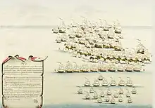10 Ships of the line, 6 frigates, 836 guns[3] | 14 Ships of the line, 8 frigates, 23 auxiliary vessels, 1,100 guns[3] | ||||||