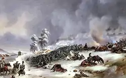 The Battle of Krasnoi (at Krasny or Krasnoe) unfolded from 15 to 18 November 1812 marking a critical episode in Napoleon's arduous retreat from Moscow.[12] Over the course of six skirmishes the Russian forces under field marshal Kutuzov inflicted significant blows upon the remnants of the Grande Armée, already severely weakened by attrition warfare.[13][14] These confrontations, though not escalated into full-scale battles, led to substantial losses for the French due to their depleted weapons and horses.[15]