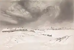 A blizzard struck on 14 November, bringing heavy snowfall of approximately 5 ft (1.5 m) and a temperature plummet to -21 °R (= -25°C or -14°F).[lower-alpha 6] This led to further casualties among men, horses, and the abandonment of artillery.[46] Ostermann-Tolstoy, part of Miloradovich's avant-guard, shelled Napoleon and his guards, but the assault was repelled.[47] While Miloradovich desired to attack, he was not granted permission by Kutuzov. Meanwhile, Claparède and the Vistula-legion arrived at Krasny since August occupied by a small French battalion. They were expelled by Ozharovsky's flying column.[48]