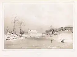 Ney suffered more than half of his forces' losses, with nearly all the cavalry and all but two artillery pieces vanishing.[150] The devastating defeat of the III Corps prompted Miloradovich to offer Ney another opportunity for an honorable surrender.[151] In the early evening, Ney chose to withdraw with his remaining troops.[152][153] Following the advise of colonel Pelet he maneuvered around the Russian forces at Mankovo, tracing the Losvinka's path for several hours. By 9 p.m., they reached the desolate Syrokorene, located about 13 km north. There, they encountered a reserve of red beets, which they prepared for sustenance. At some point during the night, Ney learned of the impending threat by Denisov.[154]}} Amidst the darkness, he opted for a daring crossing of the Dnieper, purportedly between the remote hamlets of Alekseyevka, Varechki or Gusino. These spots boasted shallow river points but nearly vertical slopes.[155] Sappers employed logs and planks to create makeshift crossings over the ice. One by one, but not without significant losses, they managed, leaving two guns, part of the detachment and wounded who could not continue.[156][lower-alpha 22] Ney's men enduring the crossing on all fours,[157] with the elements and the Cossacks reduced their ranks to a mere 800 or 900 resolute soldiers.[158][159][160]