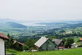 ![]() The Linth River curves around the base of the Buchberg at left center before flowing into Lake Zurich. | |||||||