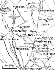 After crossing the flooded Broembeek at its confluence with the Steenbeek near St Jean, just before the point where the Steenbeek becomes the St Jansbeek, through a wide and shallow depression filled with mud, the 2nd Division captured the villages of St Jean, Veldhoek and Mangelaere on the outskirts of the forest and drove back the Germans from several fortified farms and pillboxes.[49] The average depth of the advance was 1.25 mi (2 km) and was accomplished in four hours, despite the ground conditions, with fewer than 500 casualties; I Corps took 300 prisoners. Despite rain, low cloud and high winds, French airmen had flown low, strafed German infantry and carried out tactical reconnaissance. On the right of the French, the Guards Division co-operated in the capture of Koekuit, having also crossed the mud of the Broembeek. German counter-attacks recovered a strongpoint at the north end of the French attack front, until expelled in by a local counter-attack. On the left flank of the Franco-British offensive, the attack was a complete success.[50]