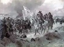 The initial clash favoured the Dutch and Danish squadrons. The disparity of numbers – exacerbated by Villeroi stripping their ranks of infantry to reinforce his left flank – enabled Overkirk's cavalry to throw the first line of French horse back in some disorder towards their second-line squadrons. This line also came under severe pressure and, in turn, was forced back to their third-line of cavalry and the few battalions still remaining on the plain.[59] But these French horsemen were amongst the best in Louis XIV's army – the Maison du Roi,[60] supported by four elite squadrons of Bavarian Cuirassiers. Ably led by de Guiscard, the French cavalry rallied, thrusting back the Allied squadrons in successful local counterattacks.[61] On Overkirk's right flank, close to Ramillies, ten of his squadrons suddenly broke ranks and were scattered, riding headlong to the rear to recover their order, leaving the left flank of the Allied assault on Ramillies dangerously exposed. Notwithstanding the lack of infantry support, de Guiscard threw his cavalry forward in an attempt to split the Allied army in two.