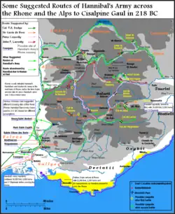 - ↑ At the time, the Gallic tribes that inhabited the eastern bank of the river were the Sallyas, who lived next to the territory of Massalia, the Cavari, a Gallic tribal confederation who lived to their north, the Vocontii to the north of the Cavari and the Allobroges to the north of the Vocontii.[126]