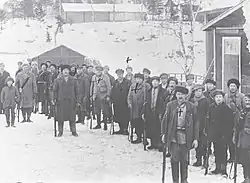 The first confrontation in Ruovesi occurred on 5 February, as the Reds crossed the frozen lake Palovesi and reached the road connecting Kuru and Ruovesi. 200 Whites of the Vöyri Military Academy managed to push the Reds back and secure the road.[2] Minor clashes occurred on 12 February. A day later, the Reds launched a major offensive against the Ruovesi village from three directions. They were joined by a group of 500–600 Russian volunteers, commanded by the second lieutenant G. A. Stolbov. The Soviet unit included 250–350 anarchist sailors from the Baltic Fleet battleships Poltava and Respublika, and the destroyer Orfei, that were docked in Turku. The sailors were heading back home by train via Tampere, but had decided to participate the war on the Tavastia Front on their way to Soviet Russia.[5][6][7]