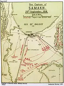 During the unsuccessful attack of the 5th Cavalry Division on Nazareth in the early morning of 20 September, Liman von Sanders accompanied by General Kiazim, Major Prigge and Rittmeister Hecker, had escaped on their way to Damascus. They arrived at Tiberias during the afternoon of 20 September, before continuing on to Samakh and Deraa.[6][7][8] He alerted the garrisons he passed to the advance of the EEF and ordered the establishment of a rearguard line. The line was to run from Deraa down the Yarmuk River Valley, across the Jordan River and west to Samakh, around the shore of the Sea of Galilee to Tiberias and northwards to Lake Huleh. Two main roads and the railway lines to Damascus, would be protected and time gained for the development of the defence of Damascus, if the garrisons were not defeated.[4][9][10] Liman von Sanders described Samakh "as the essential link between the two main sectors of the line" but also "the weak link between the two-halves."[11][12] He reinforced the garrison at Samakh with German machine gunners and ordered the commander, a German officer to hold the town to the last man.[9]