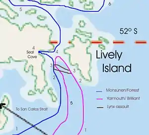 At 4:00 am GMT on 23 May,[1] a Lynx helicopter from HMS Brilliant identified Monsunen while the latter was heading to the north, west of Lively Island. After a surrender order was radioed to the motorboat, another Lynx transporting a Special Boat Service (SBS) team tried to intercept her. The aircraft was engaged by heavy machine gun and small arms fire, so it was forced to abort the mission.[4][5] At the same time, the coastal ship's radar detected the British squadron about eight miles (13 km) to stern and approaching aggressively.[2] Corvette Lieutenant Oscar Vázquez, Gopcevich's second-in-command, later reported that while Brilliant was approaching them from the south, Yarmouth sailed ahead to Choiseul Sound, blocking the passage from the north.[6]