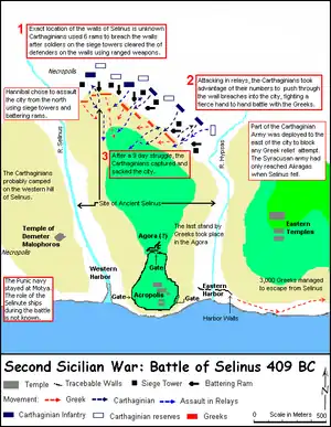 ![]() Punic campaign against Selinus 409 BC. Political boundaries and path of troop movement are inexact because of lack of primary source data. Source map created by Marco Prins-Jona Lendering | |||||||||