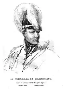 Stapleton Cotton's cavalry consisted of John Le Marchant's heavy brigade (3rd and 4th Dragoons and 5th Dragoon Guards), John Slade's heavy brigade (1st Dragoons, and 3rd and 4th Dragoon Guards) and Frederick Ponsonby's (in temporary command due to General Anson's absence) light brigade (12th, 14th and 16th Light Dragoons).[3] Only Ponsonby's brigade and the 5th Dragoon Guards were involved in the fighting.