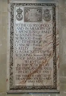 The Battle of the Falkland Islands was a First World War naval action between the British Royal Navy and Imperial German Navy on 8 December 1914 in the South Atlantic. The British, after their defeat at the Battle of Coronel on 1 November, sent a large force to track down and destroy the German cruiser squadron. The battle is commemorated every year on 8 December in the Falkland Islands as a public holiday.