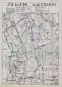Around dawn a heavy mist formed and at 5:40 a.m. the barrage began. On the right, the short advance to the first objective (red line) was met with opposition from dugouts south-west of Hessian Wood, Jarrocks Farm, Pioneer House and a small wood nearby. Machine-gun fire was also encountered from Hollebeke Château and the railway embankment. The right battalion reached the objective on time but the two to the left had many casualties, lost touch with their flanking units and the barrage, until the pause on the red line (first objective) allowed them to reorganise, mop-up and regain touch with units which had lost direction. The third battalion on the left was still held up by Hessian Wood so a defensive flank was formed facing north.[36]