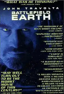Battlefield Earth frequently appears on worst film lists,[96][97][98][99] and is included on Rotten Tomatoes' "100 Worst of the Worst Movies" list.[100] Rotten Tomatoes ranked the film 27th in the 100 worst reviewed films of the first decade of the 21st century.[6][101] The Arizona Republic listed it as the worst film of 2000, and called it a "monumentally bad sci-fi flick".[102] In 2003, Richard Roeper placed the film on his alphabetized list of his forty least favorite films of all time, writing, "The real danger of Scientology is that John Travolta may someday make another movie based on the writings of L. Ron Hubbard."[103] In 2001 the film received the "Worst Picture" award from the Dallas-Fort Worth Film Critics Association.[104] James Franklin of McClatchy-Tribune News Service put the film as the worst of his "summer blockbuster bombs" list, giving it a rating of four stars for "traumatic" on his scale of how the films "generate a perverse sense of nostalgia".[105] Christopher Null of Filmcritic.com listed the film's villain Terl at number 8 of his "10 Least Effective Movie Villains", writing: "we still can't imagine how anyone would go face to face with one of these creatures and react with anything other than simple laughter."[106]