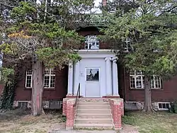 The house is a 2½ story masonry structure, built out of dark red brick, with a green terracotta tile roof and a fieldstone foundation. An enclosed porch extends along the south side of the building, and there is a circular solarium on the north side. The main entrance faces east, and is flanked by sidelights, with a transom window above which has stained glass highlights in a sailing motif. The entry is sheltered by a portico supported by Ionic columns and Doric pilasters.[2]