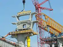 On April 24, 2013, the Port Authority's Board of Commissioners awarded a $743.3 million contract to a joint venture of Skanska Koch and Kiewit Infrastructure Company.[44][53] The construction involved building support columns first, then adding prefabricated road segments using a gantry crane that rolled on top of the arch.[40] The gantry crane would construct one rope-supported section of the new roadway at a time, using a temporary beam to support the existing roadway while each rope was replaced. The existing roadway would then be removed.[52] Temporary bridge closures allowed new floor beams to be attached to the arch's ropes in order to support steel stringers that would hold up the new roadway.[40] This work was expedited by Barack Obama's presidential administration due to the importance of the project to national commerce, being one of the first applicants to Obama's "We Can't Wait" initiative of important infrastructure projects.[44][7] New Jersey Governor Chris Christie also considered the project a high priority for his state.[54]