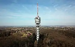 Bazita Peak TV Tower is a 100 m (330 ft) broadcasting tower in Zalaegerszeg, Hungary. The tower has a 13 m (43 ft) antenna atop the main structure and an observation level 60 m (200 ft) up the structure. The Alps can be clearly seen from the observation deck. Built in 1975, an elevator transports visitors to the café on the observation level and a staircase outside of the main shaft allows maintenance access.