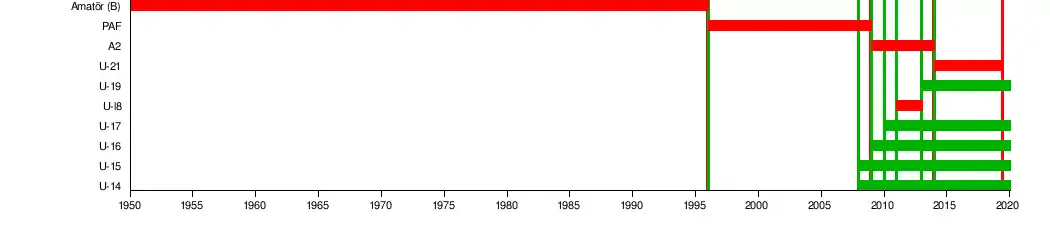The senior section were formerly known as "Beşiktaş J.K. Genç Takımı",[12][13][14] "Beşiktaş J.K. Amatör" or "Beşiktaş J.K. B Takımı"[15] until 1996, "Beşiktaş J.K. PAF Takımı" between 1996 and 2009,[16] "Beşiktaş J.K. A2" between 2009 and 2014[17] and, "Beşiktaş J.K. U-21" between 2014 and 2019.[10][11] Since 2019–20 season, the senior section is the age group of 19 (U-19).
