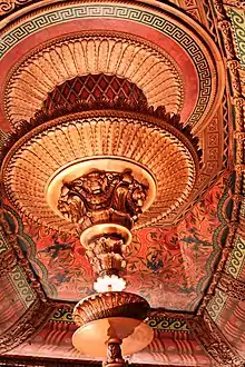East of the vestibule is a circular rotunda with Rococo-inspired decorations. The rotunda ceiling is as high as the auditorium itself; it contains moldings of rosettes and coffers, as well as a large chandelier hanging from its center.[12][17] The western wall of the rotunda, which leads from the entrance vestibule, contains fluted pilasters on either side. Above the doorways is a landscape mural by Valdemar Kjoldgaard.[12][18] Some time before a renovation in 2008, the mural had been covered with wallpaper, though the artwork was restored during the renovation.[8] On the eastern wall of the rotunda is a passageway flanked by Ionic-style pilasters, which reach from the floor to the ceiling. Above the passageway is a decorative panel, as well as an archway with full-height colonettes on the mezzanine and balcony levels.[12][17]