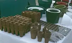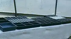Many bedding plants were grown in the same old glass greenhouses with a boiler, fin tubing and manual ventilation. But the new greenhouses on the same property or at a new site were simpler and cheaper. The new greenhouses were made with pipe bows and covered with air-inflated double polyethylene roofs.[18] These greenhouses could be erected by the greenhouse crew and allowed many new entrepreneurs to enter the bedding plant business. The structure, with a gravel floor, was usually 30 feet (9 m) wide and 100 feet (30 m) long, with an overhead heater (propane or natural gas) and fan ventilation. Thermostats operated the fan(s) and heater(s) for better environmental control. There were no internal supports for the greenhouse roof so carts and tractors could be used to move plants and supplies. Vacuum formed plastic trays and packs were now available and made bedding plant production more versatile. Some growers used soil-based potting soil (1 part sterilized field soil:1 part peat moss:1 part perlite) but progressive growers were using the Cornell peat-lite mix (1 part peat moss:1 part vermiculite).[19] Most plants were grown from seed at the greenhouse and cuttings of geraniums, mums, etc., were available from specialty producers. The plastic trays and plastic hanging baskets were easy to transport in light trucks to garden centers and farm stores.