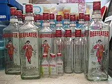 Beefeater Gin is a brand of gin owned by Pernod Ricard and bottled and distributed in the United Kingdom. Beefeater remained in the control of its founding Burrough family until 1987. It is a 47% or 44% alcohol product (94 proof) in the US, and a 40% alcohol product (80 proof) elsewhere in the world (including the UK). The Beefeater distillery is one of 24 in London.[1]