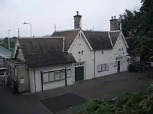 The original station building, which was little more than a cottage, was replaced in 1847 with the substantially larger white brick building with ashlar trimmings which still exists. This is notable for its carved bargeboards, some remaining diagonal paned windows and the pseudo-heraldic shields with 'MR' and '1847'.[8] The wooden platform canopies and adjacent wrought-iron and glass canopy were installed in 1871. The wooden platform canopies were originally located at Southwell railway station, and were relocated to Beeston when Southwell was rebuilt.[9]