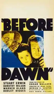Before Dawn is a 1933 American pre-Code drama film directed by Irving Pichel and written by Garrett Fort. The film stars Stuart Erwin, Dorothy Wilson, Warner Oland, Dudley Digges and Gertrude Hoffman. It is one of the few Oland films from this period in which he does not play an Asian character. The film was released on August 4, 1933, by RKO Pictures.[1][2][3]