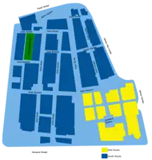 The new Souks are a low rise complex[14] of two components: the South Souks and the North Souks. The Souks were designed in five different commissions by international and Lebanese architects. They offer 163,010 square metres (1,754,600 sq ft) of floor space and 17,307 square metres (186,290 sq ft) of pedestrian areas that follow the ancient Greek street grid.[13]