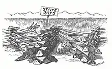 On the other hand, Democratic newspapers enthusiastically supported Hughes' candidacy. This was especially the case with the Denver Mirror, a small newspaper that was published by Stanley G. Fowler.[62] Hughes' opponent, Territorial Governor John Routt, did not make any public speeches during the campaign.[59] He preferred to meet and greet voters face-to-face. At one Republican event, Routt acknowledged that he was not using rhetorical skills like his opponent. He said: "I cannot soar as high as some of my friends on the other side, but I am short and spry, and when it comes to getting into the political pastures I can get in just as quickly as they by crawling through; perhaps I can beat them in, for they have to soar high to avoid the fences." The Denver Mirror then used the image of Routt crawling through the fences to paint him in multiple cartoons as a carpetbagger, who had not been elected but appointed to the territorial governorship by President Grant after serving in different political roles in Illinois and Washington, DC.[62] The first cartoon was published on September 17, 1876. Fowler was successful with his cartoons, which were received attention across the whole state. Routt was amused by the caricatures and began to distribute copies of them at his campaign events.[62] In its last cartoon concerning the 1876 State Elections on October 1, 1876, the Denver Mirror called its readers to support Hughes and other Democratic candidates, stressing their support for the Silver Dollar and political reforms, while alleging that a Republican state government would be tainted by corruption.[63]