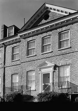 "The principal or garden façade faces south and is seven bays in length. The central bays are set in 2 ½ -story, pedimented pavilion which has a bull's-eye window set within the pediment. The north façade has a pediment, but no projecting pavilion. All first and second floor windows have segmental arches of alternating header and stretcher brick and contain 6/6/ sash. Between the two floor levels a brick belt course with molded cap extends around all four elevations.