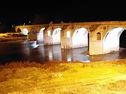The bridge was constructed between 1865 and 1867 by Bulgarian architect and master builder Kolyu Ficheto on the order of Turkish statesman Midhat Pasha, when Bulgaria was part of the Ottoman Empire. While other architects were willing to build it for 2 to 3 million groschen, Kolyu Ficheto was willing to build it for 700 thousand.[1] When asked to confirm this sum, he replied that Midhat Pasha could take his head if he didn't succeed doing it for this sum.[2] It is 276 m long and 6 m wide, has 14 arches each with a clearance of 12 m and decorated with relief images of animals. Constructed from local limestone and limestone plaster, it is supported by 13 props with cutwaters.[1]