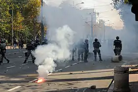 Anti-gay and anti-government protesters fought with about 5,000 armed police,[2] throwing Molotov cocktails, bricks, stones, glass bottles and firecrackers;[3] the police used tear gas and rubber bullets.[1] There were no fatalities.[1]