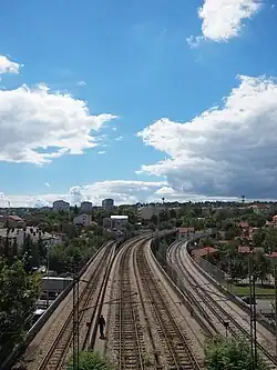 The Zemun railway station was built from 1977 to 1981 when was opened, even though it was never fully finished.[5] In the early 1980s, the marshaling yard in Makiš was arranged. In 1982 the double-track railway Zemun-Zemun Polje was finished and part of the passenger-technical Zemun railway station was built. In 1984 double-track railway New Belgrade-Belgrade Centre, across the New Railway Bridge was finished, so as the "Senjak" tunnel, the continuation of the bridge, which connects it with the Prokop station. In 1988 the two single-track railway tubes ("Dedinje" tunnel) were finished, establishing the connection Belgrade Centre-Rakovica-Jajinci. The tunnel is 3 km (1.9 mi). There were significant problems during the digging under the Humska Street (Partizan Stadium) and the royal palace of Beli Dvor.[2][6]