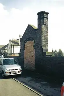 Ever present vandalism continued to leave the station buildings in a dangerous state,[2] and the B-BAG reluctantly decided to demolish three of the station buildings – the Gentleman's toilets; Station Master's Office; and Ladies' Room and General Waiting Room buildings were removed on 18 and 19 June 1977. The Booking Office; Stairs; and "tunnel rooms" were bricked up for later use.[2][12] The remaining structures were removed in 1985, leaving only the platform and bricked up road-level entrance.[8][13] The entrance archway remains to this day, though bricked up, as can be seen on recent photographs.