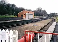Construction progress was hindered by repeat vandalism, with the toppling of freshly laid brickwork on several occasions.[35] Brickwork was complete to roof level by late January 2000,[36] with a variety of fitting-out, including connection to services and the installation of roller-shutter doors, plastering, and decoration, taking place throughout mid-2000.[37][38] Shortly after, however, the contractor was unable to continue work, and further progress would not take place until July 2001 after a new contractor was assigned to complete the building and tarmac the platform.[39] The building opened for public use soon after.