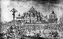 The first known historical bell tower was wooden and stood[15] on the north-eastern side of the cathedral, in contrast to the modern one, which was built to the south-east of it.[16] The wooden bell tower is depicted both in a drawing by the Dutch artist Abraham van Westerfeld (1651) and in a plan of the city of Kyiv by Colonel Ushakov (1695).[17] It was probably built by Petro Mohyla during the reconstruction of St. Sophia Cathedral in 1633–1647 – at the same time a convent was established here with his help, and its territory was surrounded by a high wooden fence or wall.[18]