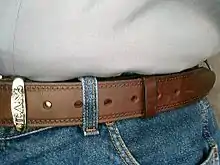 Some garments have a series of belt loops at the waist, through which a belt can be threaded. Additionally, many belts have a "keeper loop" affixed to one end, near the buckle. The keeper loop stops the free end of the belt from flapping around once the belt is buckled. Some belts also have an end tip (made of metal or leather) covering the free end of the belt to protect it from damage.[1]