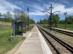 Belvoir station is a stop on the light rail Green Line of the RTA Rapid Transit in Shaker Heights, Ohio. It is located in the wide landscaped median of Shaker Boulevard (Ohio State Route 87) at the intersection of Belvoir Boulevard on the north side and Belvoir Oval on the south side.