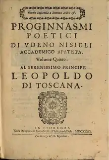 Benedetto Fioretti was born at Mercatale in the diocese of Pistoia, October 18, 1579.[1] His first attempts at poetry meeting with no success, he devoted himself to compiling a great work about poetry.[1] The result is almost indescribable. Fioretti brings together not only all that prolonged study could discover on the subject of poetry and the various branches of poetry, but also a great part of what has been said on particular poets and on their poems.[2] His lists of authorities are imposing, and the minutiae with which he is mainly concerned give his pages a forbidding aspect. There is almost no attempt at arrangement. The book is called Proginnasmi Poetici, and was published in five volumes in Florence, 1620–1639.[3] This encyclopedia was successful throughout the seventeenth century and was reprinted after the author's death. Fioretti's Proginnasmi are considered a forerunner of Francesco Saverio Quadrio's famous work Della storia e della ragione di ogni poesia.[2] Fioretti belonged to the Florentine Accademia degli Apatisti and, after the founder Agostino Coltellini, was its most enthusiastic promoter. His fellow academicians included Carlo Roberto Dati and Benedetto Buommattei. He was an acquaintance of Milton during the latter's stay in Italy.[4] Towards the end of his life he turned to religious and ethical themes. His Esercizi Morali began to appear in 1633; his Osservazioni di Creanze only came out in 1675. Fioretti died in Florence on June 30, 1642.[1]