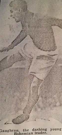 Charlie Harris, the Bohemians' trainer succeeded in inducing him to take up Association Football.[4] Gaughran believed that his rugby training gave him a good grounding for soccer and that "if one could kick an oval ball accurately there should be no great difficulty in learning how to control a round one."[6] After a few games with Bohemians' Leinster League team, he made his debut for their Free State team against Waterford at Kilcohan Park and very soon attracted the attention of a number of cross-channel clubs. Arsenal were very keen to sign him towards the close of the 1935–36 season, and sent their chief scout to sign him, but were unsuccessful.[4]