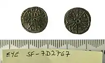 Examples of Beonna's coins are known from two separate hoards, as well as from a number of individual finds. Until 1968, only five of his coins were known. Several more coins came to light over the next decade, before a hoard of sceattas and other coins were discovered in 1980 at Middle Harling, north-east of Thetford and close to the border between the counties of Norfolk and Suffolk. In all, fifty-eight coins have been excavated from Middle Harling, fourteen were found at Burrow Hill (Suffolk) and thirty-five from other places in East Anglia and elsewhere.[27] Over a hundred 'Beonnas' are now known:[28] most of them have been acquired by the British Museum.[29]